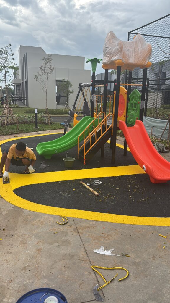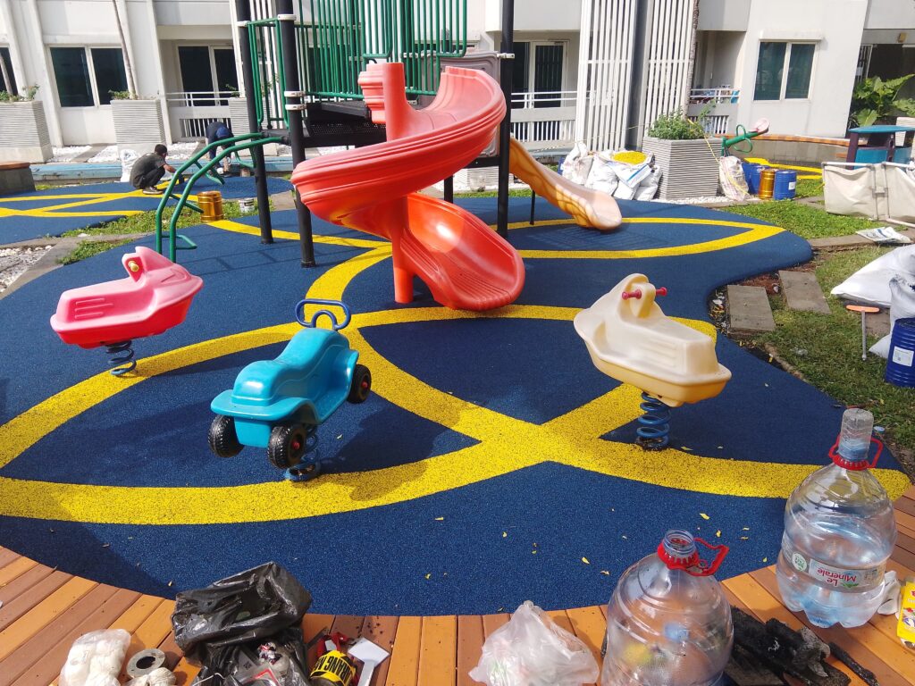 Kami juga mengerjakan lantai karet playground untuk taman bermain anak untuk area perumahan, perhotelan, apartemen dan taman – taman kota diseluruh indonesia dengan tim professional yang handal dan memiliki etos kerja yang baik