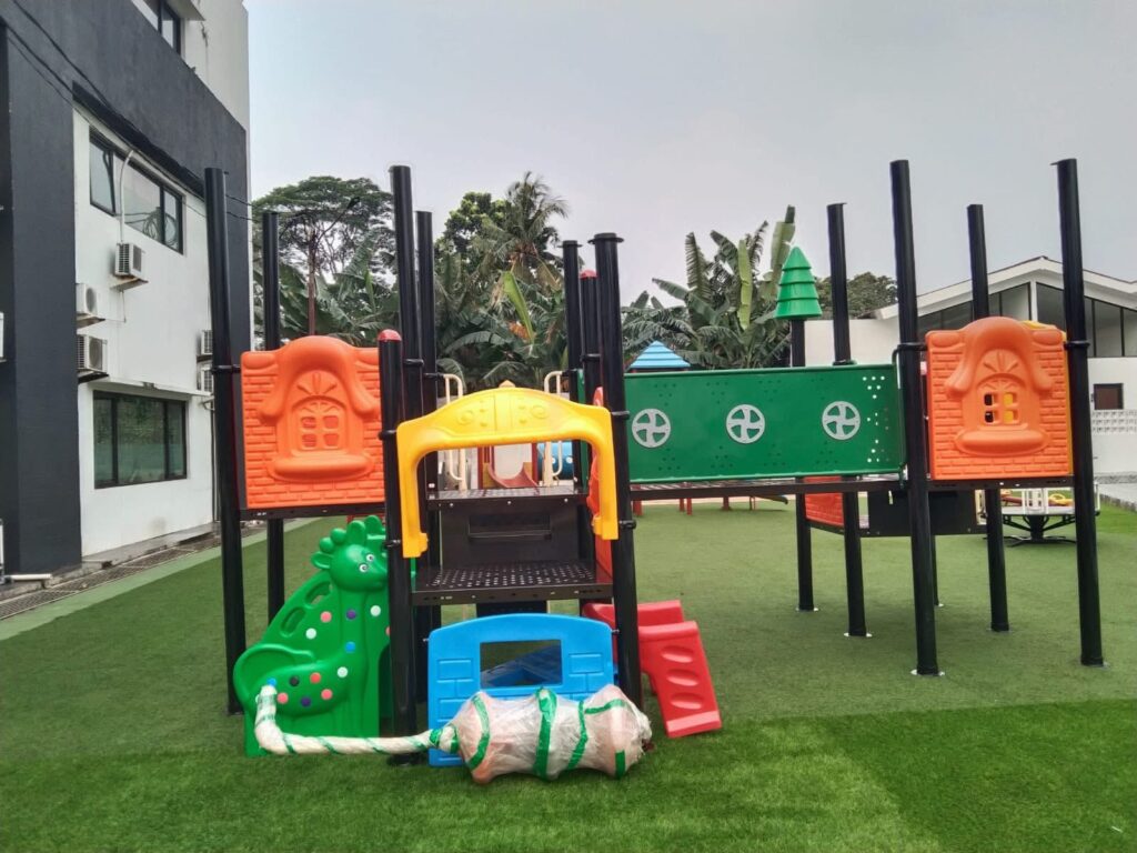 Rumput Sintetis untuk area bermain anak atau rumput sintetis untuk playground biasanya menggunakan jenis Rumput Swiss dengan ketebalan 3 cm dan ditambahkan pasir silika dan pasir karet Rubber Granules untuk menambah tinggkat elastisitas dan memberikan kenyamanan yang lebih baik untuk anak2 sehingga tidak terlalu keras jika terjadi benturan kelantai